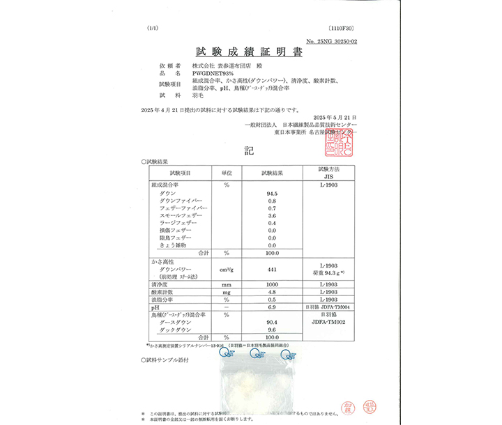 国内第三者機関に委託した羽毛性能試験結果では、ダウン率95%の結果が出ています。(品質表示上は93%と表示)